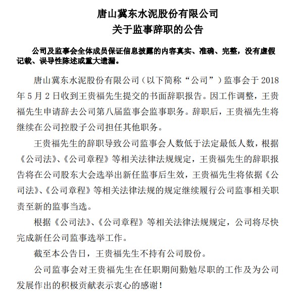 冀東水泥股份有限公司(簡稱冀東水泥)3日晚間公告稱,該公司監事會于2018年5月2日收到王貴福提交的書面辭職報告。因工作調整,王貴福申請辭去該公司第八屆監事會監事職務。辭職后,王貴福將繼續在該公司控股子公司擔任其他職務。