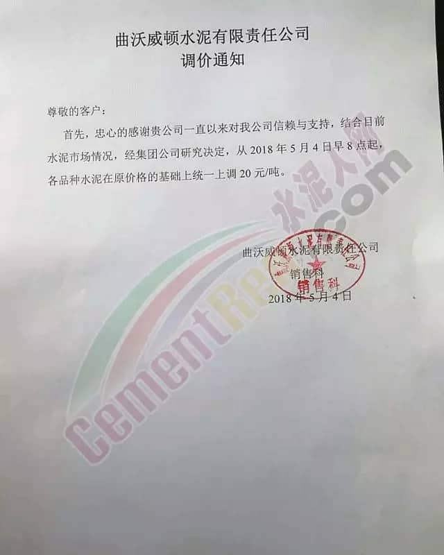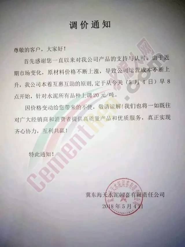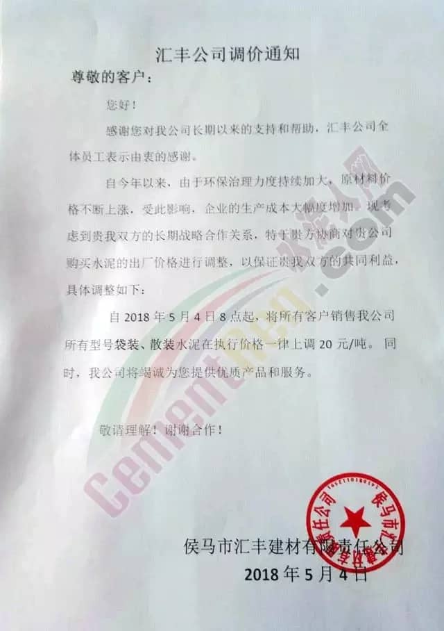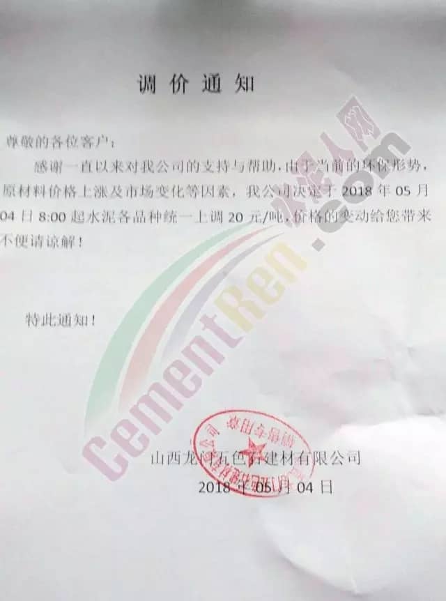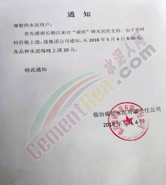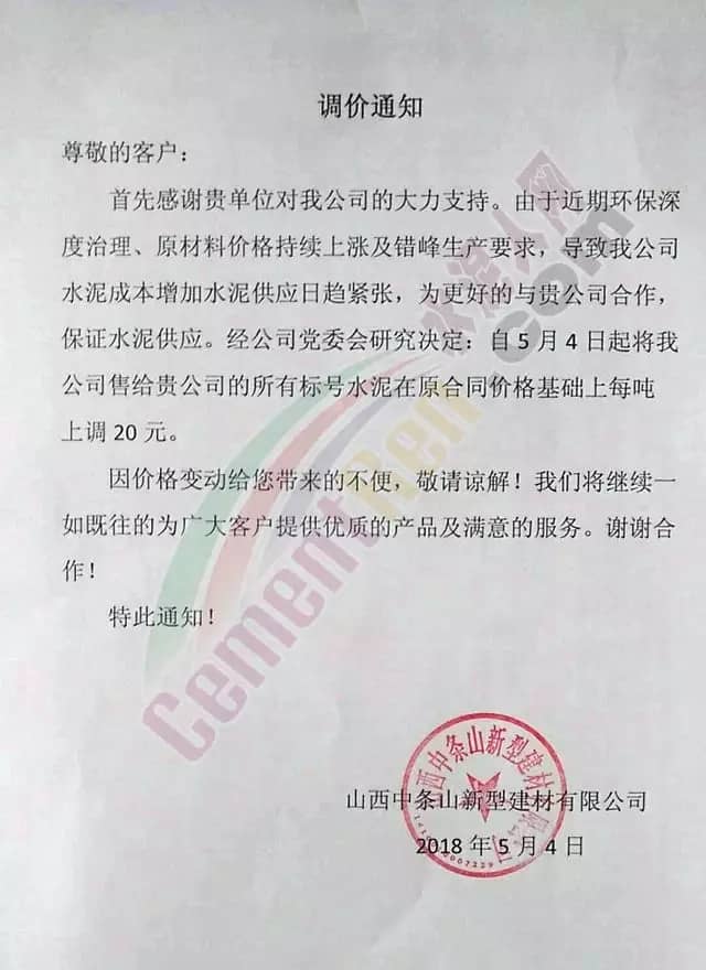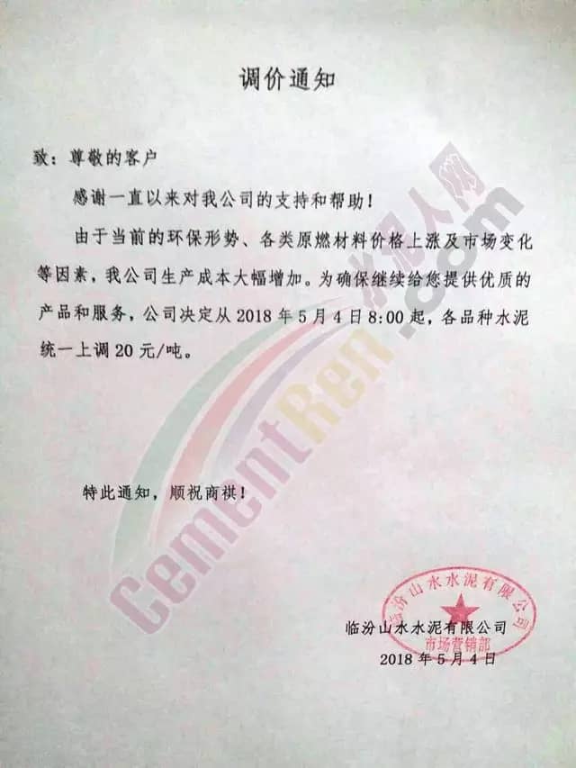 水泥人網(wǎng)5月4日消息,山西南部地區(qū)(晉南)多家企業(yè)通知下游客戶各標(biāo)號水泥在原價格基礎(chǔ)上上調(diào)20元/噸。