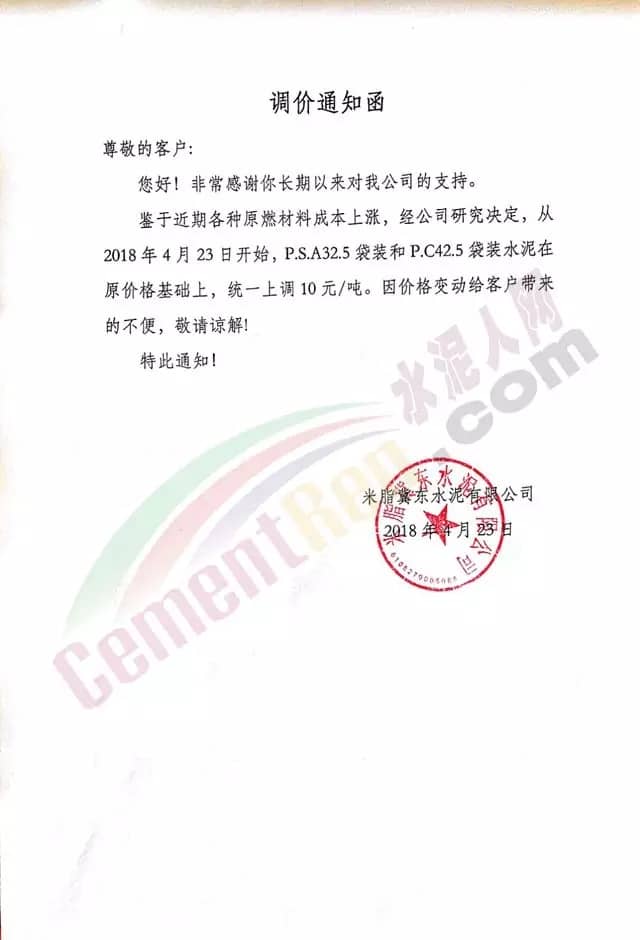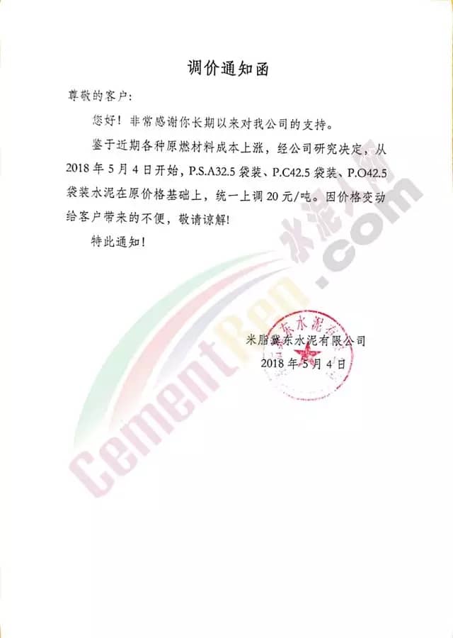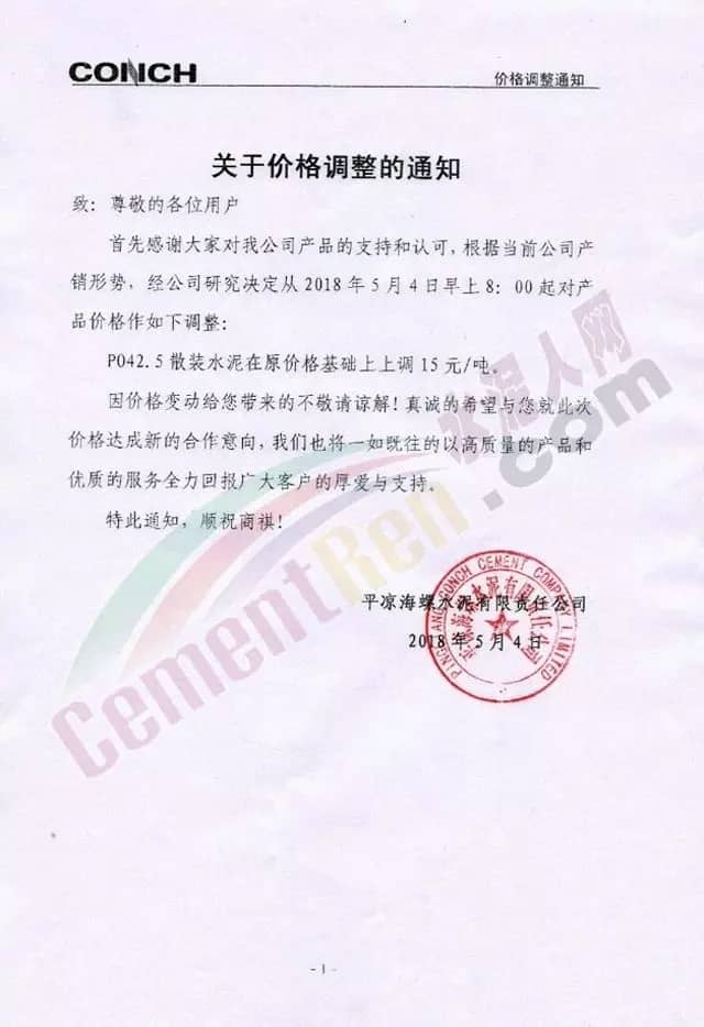 同期,甘肅平?jīng)龊B菟嗤ㄖ掠慰蛻?,根?jù)當(dāng)前公司的產(chǎn)銷形勢,PO42.5散裝水泥在原價基礎(chǔ)上上調(diào)15元/噸。