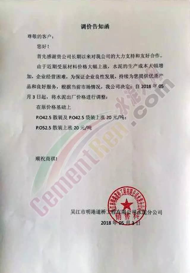 華東蘇南區(qū)域于5月3日上調(diào)水泥價格,漲幅在30元/噸。其中上海南方水泥江蘇營銷中心發(fā)布通知稱,根據(jù)市場行情和公司產(chǎn)銷情況,發(fā)往蘇南各區(qū)域散裝42.5水泥出廠價在原執(zhí)行價格基礎(chǔ)上上調(diào)30元/噸 。