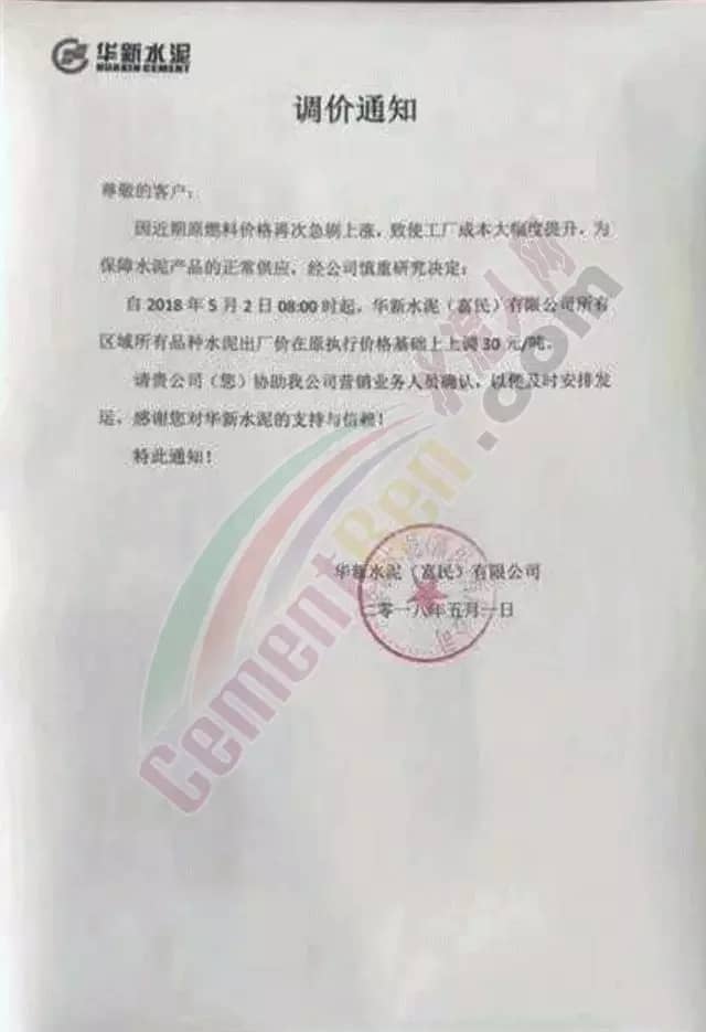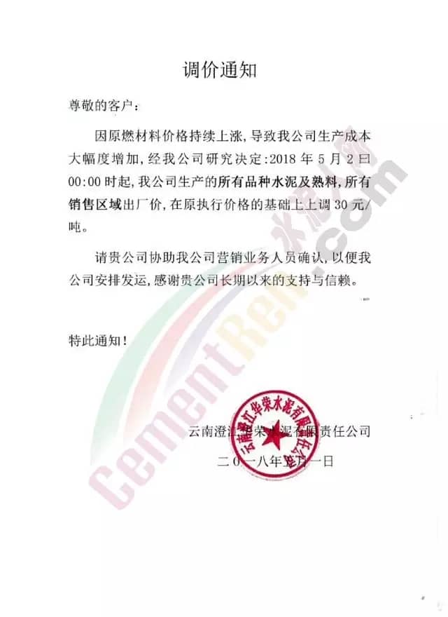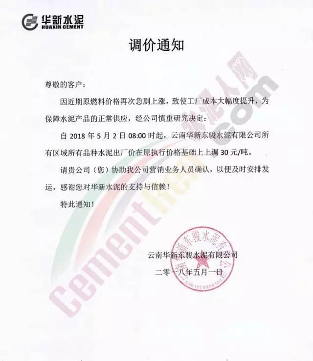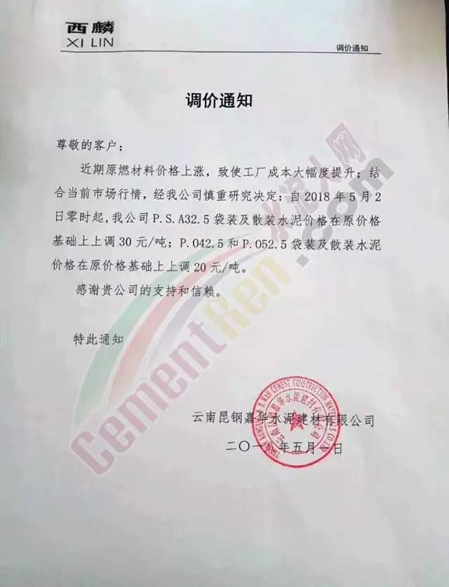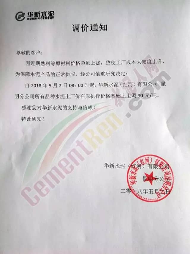 據(jù)水泥人網(wǎng)了解,自5月1日以來,大昆明區(qū)域,華新水泥、昆鋼嘉化等多家水泥企業(yè)通知上調(diào)水泥價格,漲幅在30元/噸。
