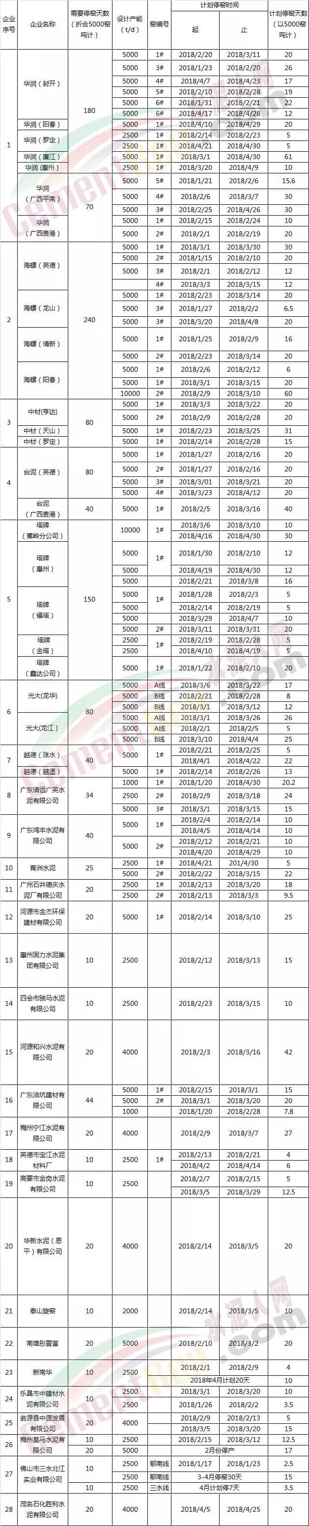 附:廣東省水泥企業(yè)錯(cuò)峰生產(chǎn)計(jì)劃(2018年1月~4月)