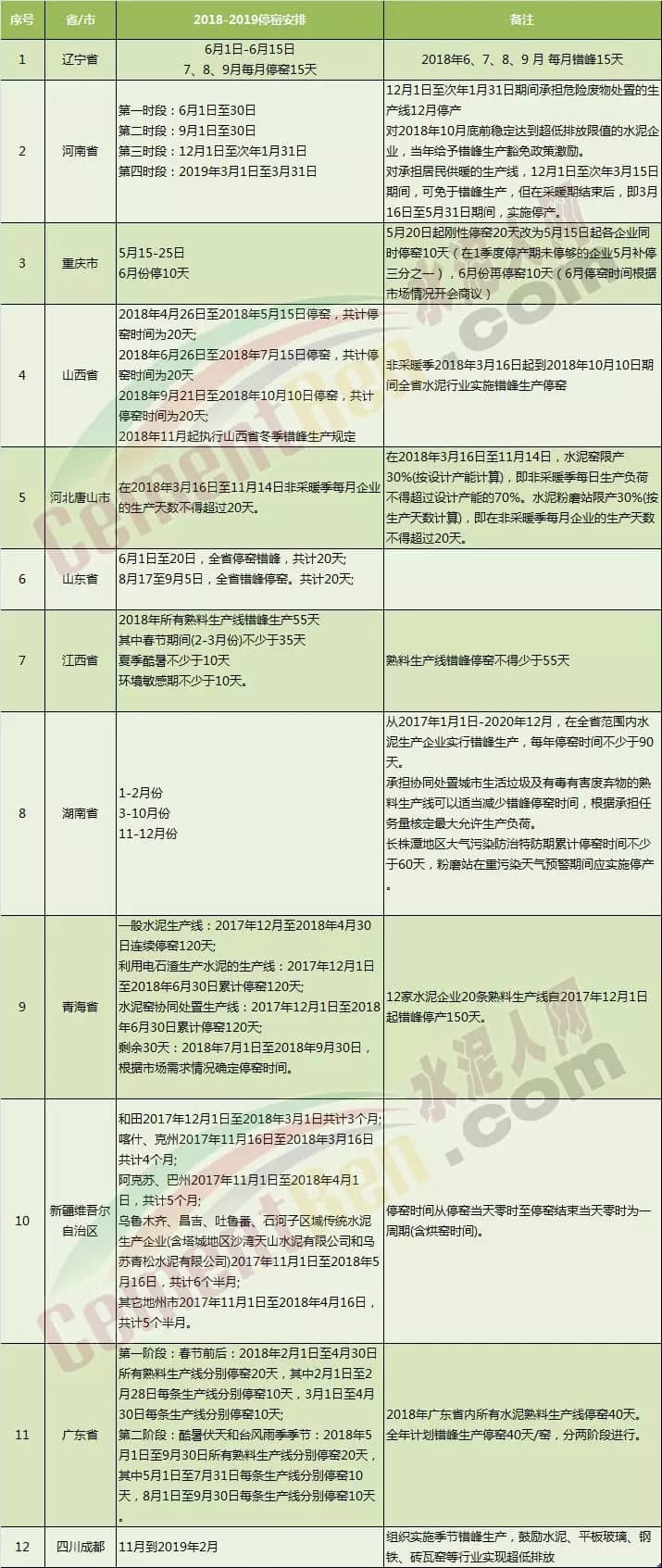 據水泥人網了解最近一段時間遼寧、河南、重慶等區域相繼出臺了2018年錯峰生產計劃 。其停窯時間均較往年加長。遼寧、甘肅等區域行業協會和主導企業也組織了非采暖季的錯峰停產相關會議,遼寧部分地區主導企業計劃在5-6月份停窯限產30日,甘肅省內主導企業于5月9日召開了錯峰生產協調會議,就非采暖季錯峰生產計劃做了布署。