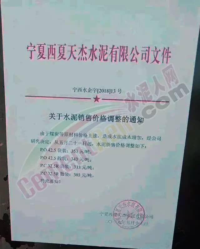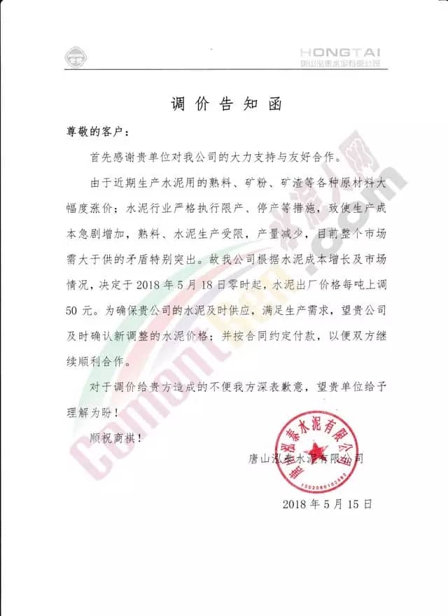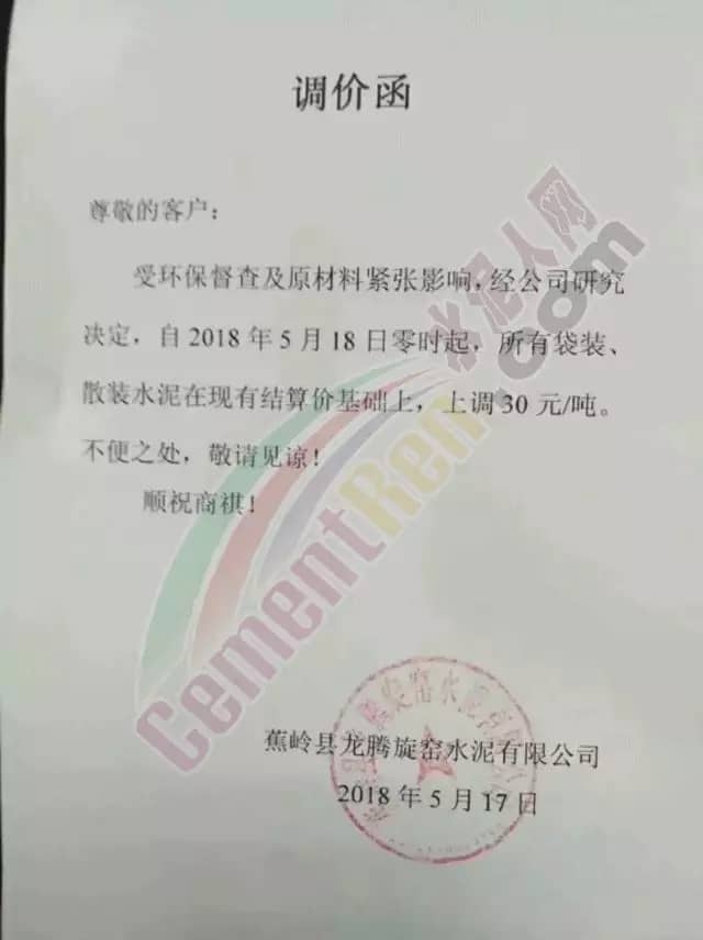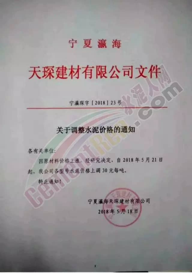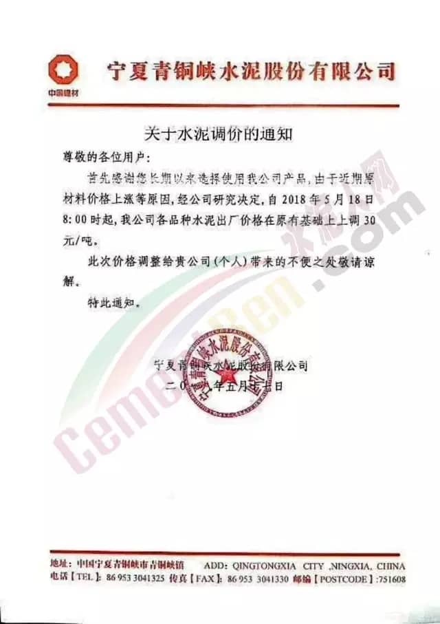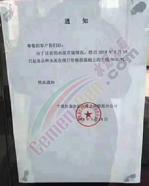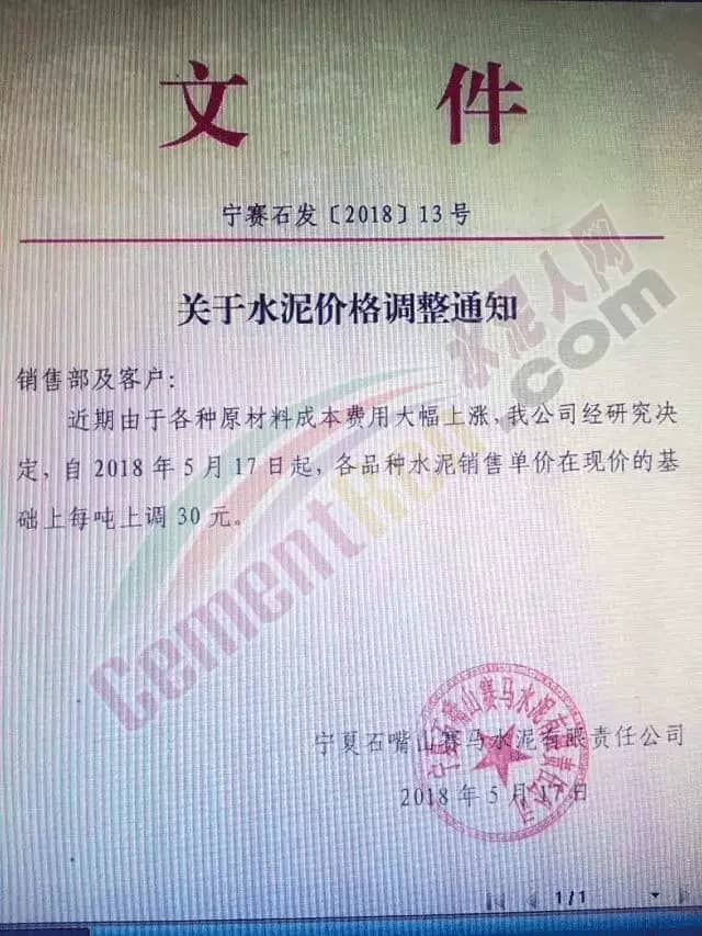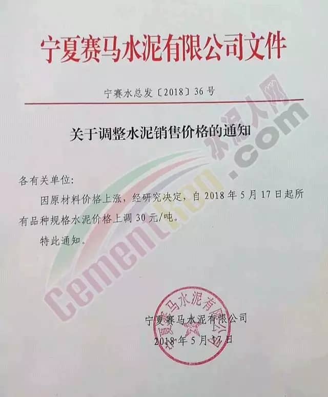 寧夏賽馬水泥關于調整水泥銷售價格的通知稱:因原材料價格上漲,自2018年5月17日起所有品種規格水泥價格上調30元/噸。其他水泥企業調價通知調價原來與此類似。