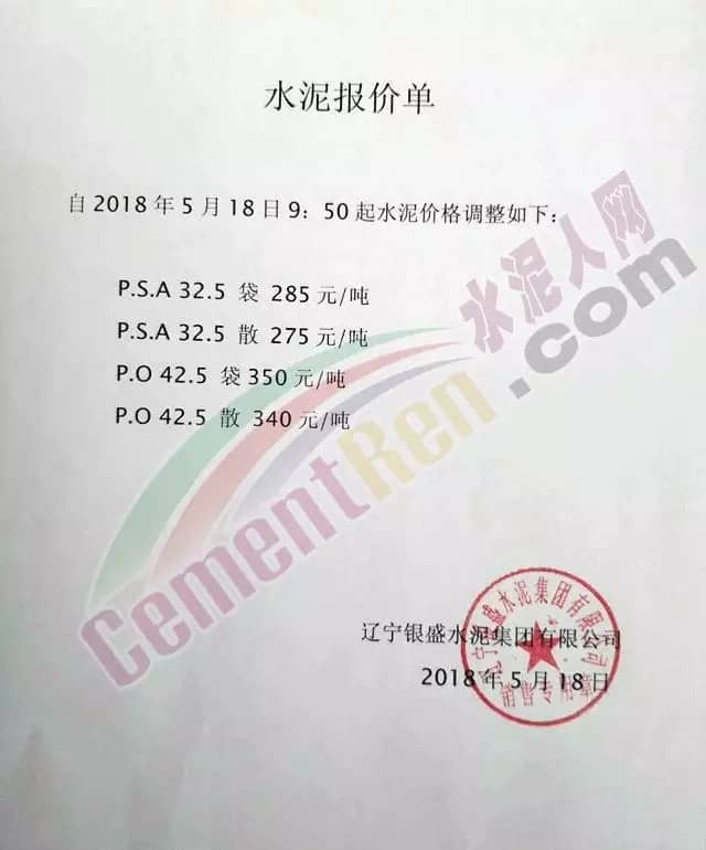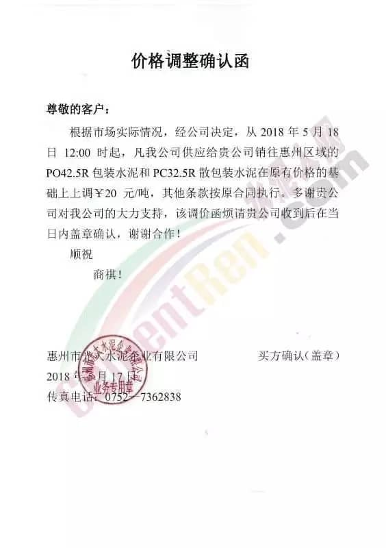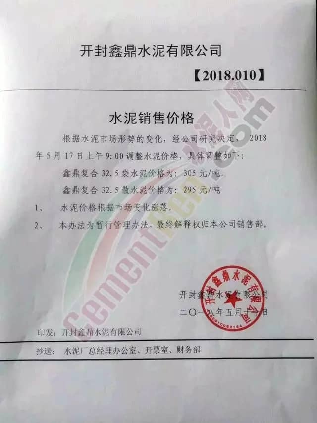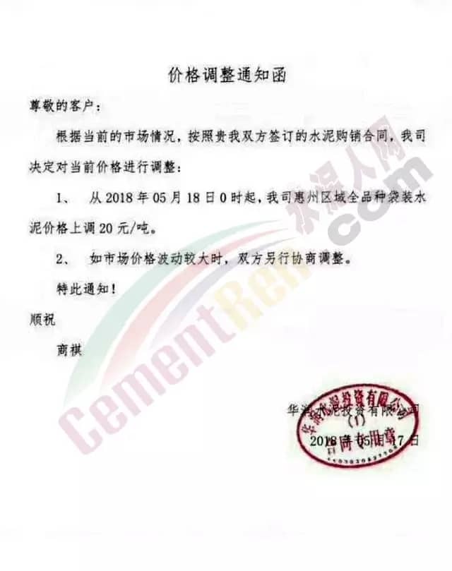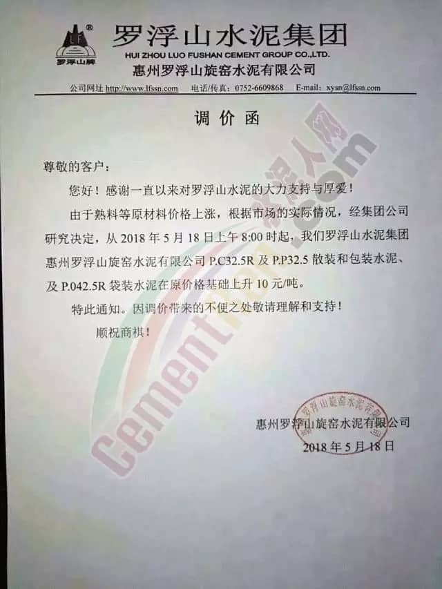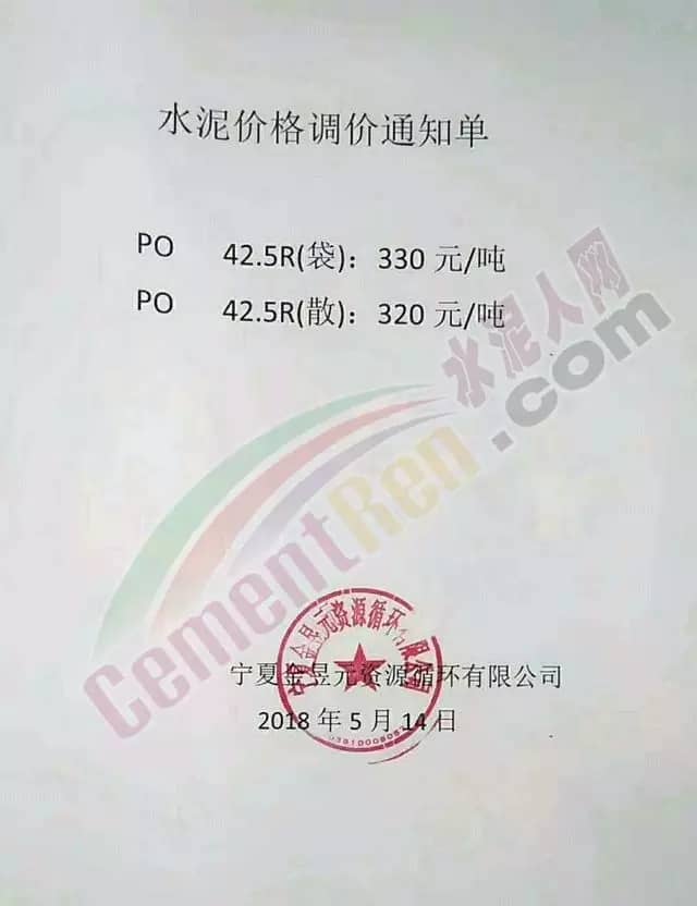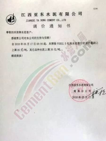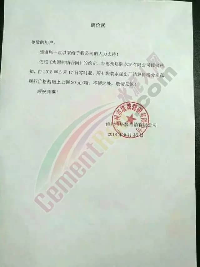寧夏賽馬水泥關于調整水泥銷售價格的通知稱:因原材料價格上漲,自2018年5月17日起所有品種規格水泥價格上調30元/噸。其他水泥企業調價通知調價原來與此類似。