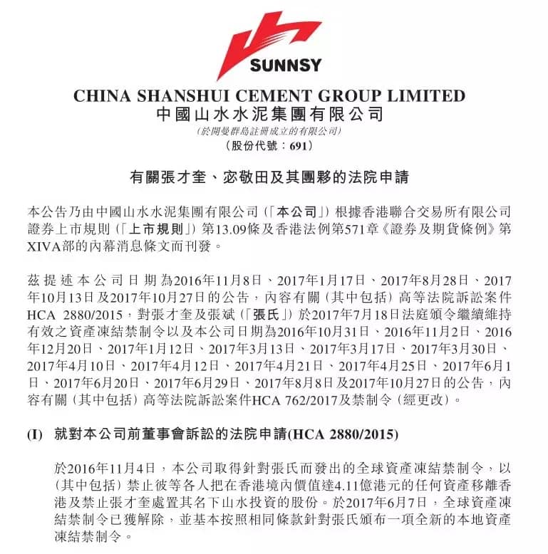 山水水泥董事會對上述行為采取非常嚴肅的處理態度,并將對所有責任方采取一切必要的措施追究損失。因此,山水水泥已指示其法律顧問向法院追加申請,增加根據禁制令所需凍結的資產金額至不少于人民幣20億元及申請對宓敬田及其團伙于香港持有的資產和證券實施限制性措施,以反映上述由宓敬田及其團伙對山東山水造成的損失。鑒于宓敬田及其團伙牽涉的非法行為所涉及的金額特別巨大,公司正就加入其他與上述損失有關的于山東山水的所有責任人作為案件被告的可能性尋求法律意見。