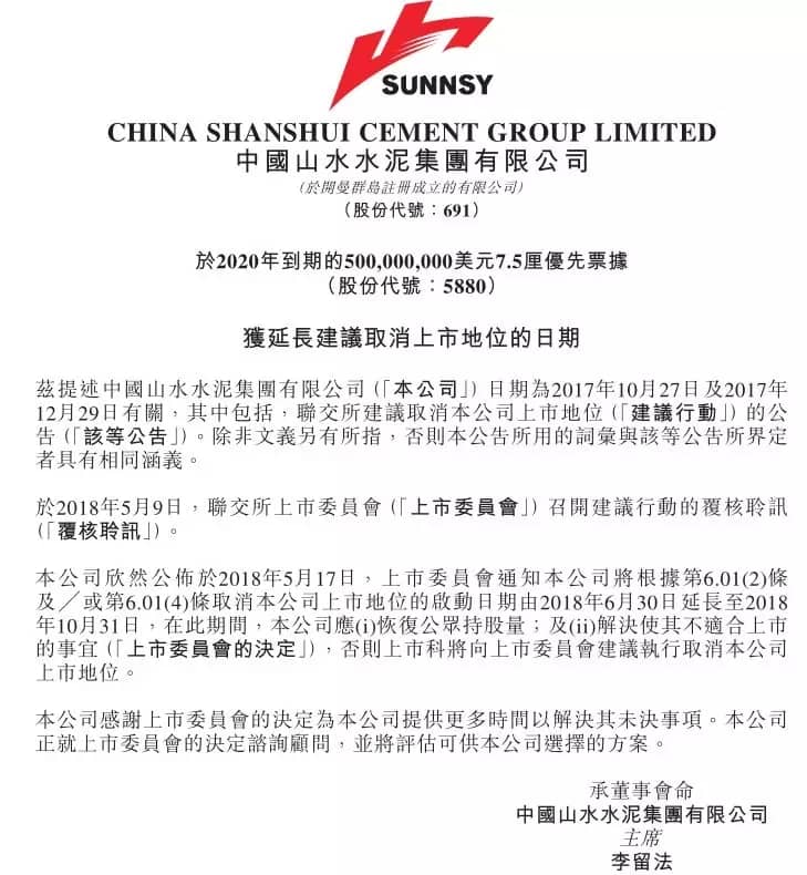 時至今日,山水水泥這場鬧劇似乎沒有任何要劃上句號的跡象,雖然數天之前,山水水泥進行了高層人事變動,也許是為將來復牌或者是解決這個復雜的局面而做的準備。至少從目前來看,山水水泥這場鬧劇如何收場并沒有一個明確的方向,山水水泥退市也是大概率事件。