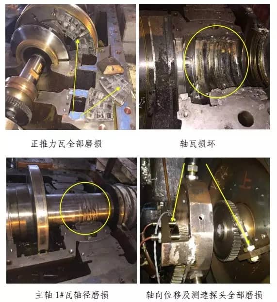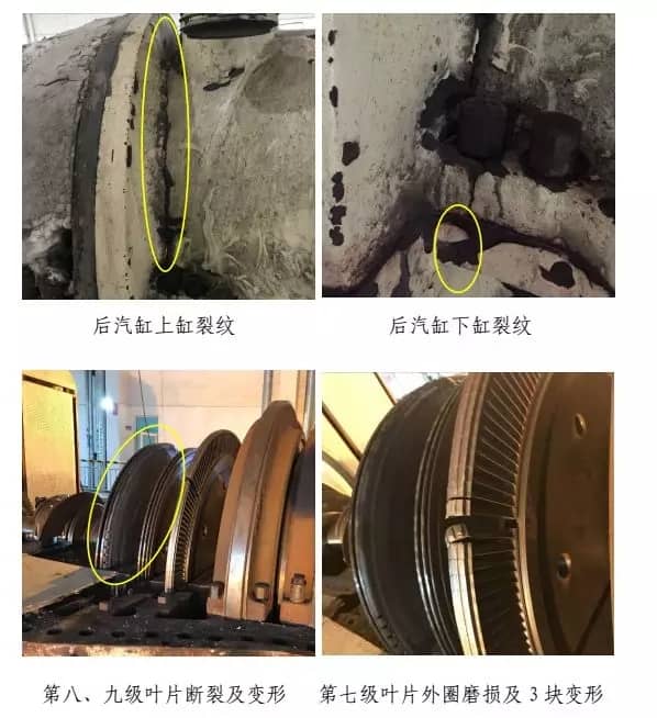 經檢查,汽輪機后缸上、下缸體開裂,第八、九級葉片全部脫落,第七級葉片外圈磨損及 3塊變形,前六級葉片外圈磨損,第七~九級隔板斷裂,隔板汽封、徑向汽封、前后汽封全部磨損,主油泵小軸斷裂及油封環磨損,主油泵擋油環斷裂,正推力瓦全部磨損,1#~4#瓦損壞,主軸1#、2#瓦軸徑磨損,軸向位移及測速探頭全部磨損,汽輪機側聯軸器及齒輪位移,盤車電機殼體斷裂,勵磁機定轉子摩擦損壞,整流盤連接線斷裂及風扇葉片磨損,凝汽器約20根銅管受損,發電機轉子需返廠檢修測試。