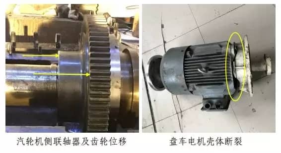 22:40分,公司領導到達現場,組織人員對現場采取保護和應急處置。恢復供電后,對 1#機組進行了初步檢查,發現排氣缸開裂,安全閥沖開,勵磁機端蓋脫落,手動盤車無法盤動等。在安排專人現場監控后向區域專業組領導、股份公司相關部室人員進行了匯報。