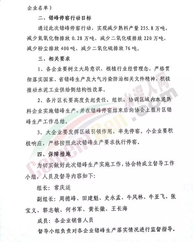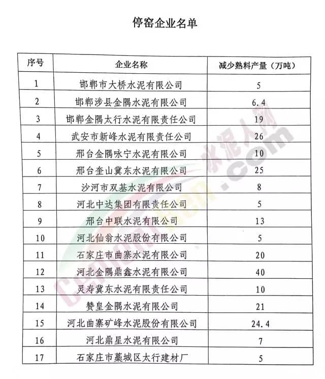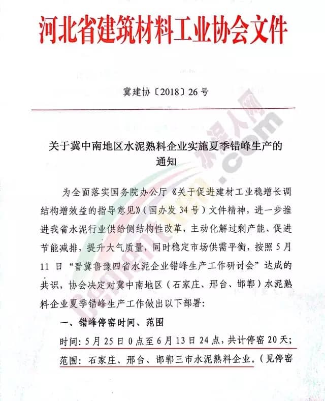 【水泥人網(wǎng)】日前,河北省建筑材料工業(yè)協(xié)會(huì)發(fā)布冀建協(xié)【2018】26號(hào)文件,《關(guān)于冀中南地區(qū)水泥熟料企業(yè)實(shí)施夏季錯(cuò)峰生產(chǎn)的通知》。通知稱,為全面落實(shí)國(guó)務(wù)院辦公廳《關(guān)于促進(jìn)建材工業(yè)穩(wěn)增長(zhǎng)調(diào)結(jié)構(gòu)增效益的指導(dǎo)意見(jiàn)》(國(guó)發(fā)辦34號(hào))文件精神,進(jìn)一步推進(jìn)河北省水泥行業(yè)供給側(cè)結(jié)構(gòu)性改革,主動(dòng)化解過(guò)剩產(chǎn)能、促進(jìn)節(jié)能減排,提升大氣質(zhì)量,同時(shí)穩(wěn)定市場(chǎng)供需平衡,按照5月11日“晉冀魯豫四省水泥企業(yè)錯(cuò)峰生產(chǎn)工作研討會(huì)”達(dá)成的共識(shí),冀中南地區(qū)(石家莊、邢臺(tái)、邯鄲)水泥熟料企業(yè)將于明日凌晨(5月25日0點(diǎn))至6月13日24點(diǎn)停窯20天。涉及范圍包括石家莊、邢臺(tái)、邯鄲三市水泥熟料企業(yè),共減少熟料產(chǎn)量249.8萬(wàn)噸。