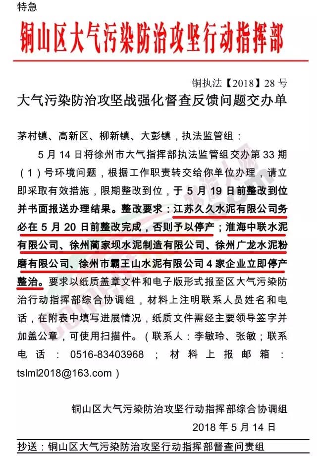 淮海中聯水泥有限公司、徐州藺家壩水泥制造有限公司、徐州廣龍水泥粉磨有限公司、徐州市霸王山水泥有限公司4家企業立即停產整治。