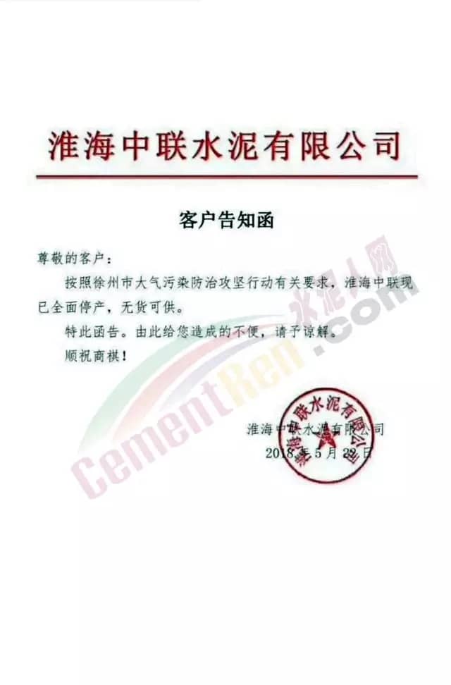 【水泥人網】5月22日淮海中聯水泥有限公司發布客戶告知函稱,按照徐州市大氣污染攻堅行動有關要求,淮海中聯現已全面停產,無貨可供。