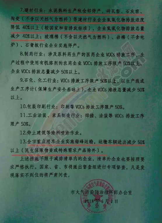 其中針對水泥建材行業提出,水泥熟料生產線全部停產。同時要求全市重點用車企業實施錯峰運輸,運輸車國內進出減少50%以上。