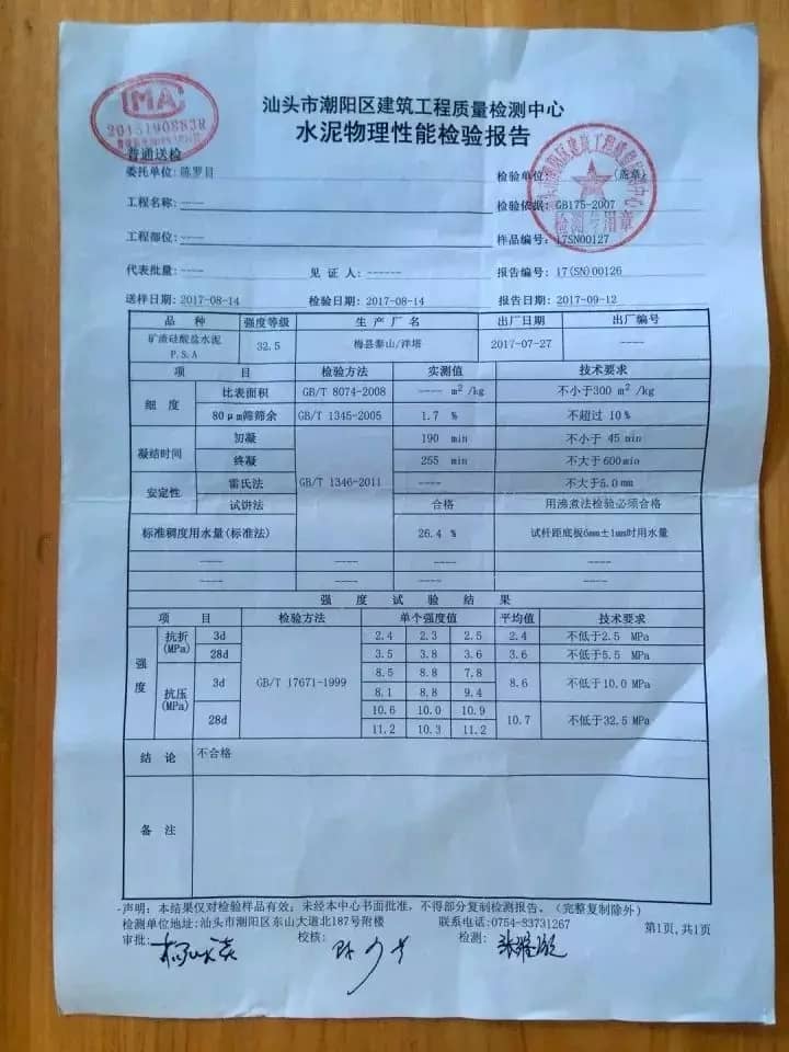 根據潮陽區建筑工程質量檢測中心9月12日出具的報告,檢驗的水泥抗折、抗壓四個項目的平均值均低于技術要求,結論是“不合格”。