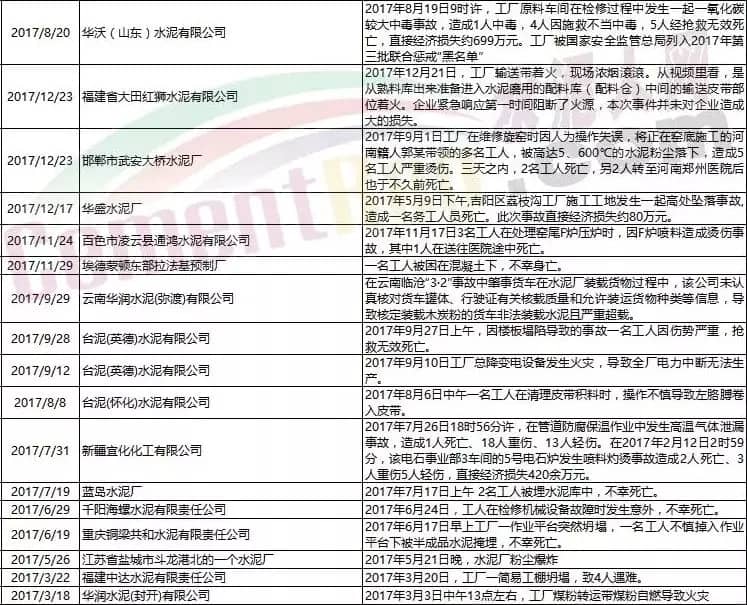 2017年水泥人網曾報道過的與水泥企業安全生產相關的事故共17起,詳情如下: