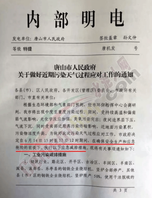 日前,唐山市人民政府再發(fā)明電《關(guān)于做好近期污染天氣過(guò)程應(yīng)對(duì)工作的通知》稱:根據(jù)生態(tài)環(huán)境部和氣象部門預(yù)測(cè),經(jīng)市環(huán)保指揮中心會(huì)商研判,唐山市將出現(xiàn)中度至重度污染過(guò)程。期間受持續(xù)高溫和偏南弱氣流影響,光化學(xué)反應(yīng)加強(qiáng),臭氧污染突出;夜間邊界層下壓氣流下沉,同時(shí)受南部近距污染傳輸影響,近地面污染累積,污染物濃度升高。為做好此次污染天氣過(guò)程應(yīng)對(duì)工作,唐山市政府決定 自6月14日15時(shí)至17日12時(shí)期間,在確保安全生產(chǎn)和應(yīng)急搶險(xiǎn)的前提下,執(zhí)行應(yīng)急減排措施。