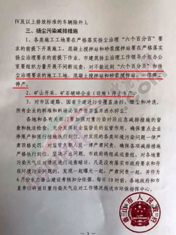 工業(yè)減排方面,建材行業(yè),水泥磚瓦窯、石膏板、礦渣微粉生產(chǎn)企業(yè)停產(chǎn);移動(dòng)源污染減排方面要求全市鋼鐵、水泥、煤炭開采等重點(diǎn)用車企業(yè)不允許運(yùn)輸車輛進(jìn)出廠區(qū);揚(yáng)塵污染減排方面要求各類施工工地要在嚴(yán)格落實(shí)揚(yáng)塵治理“六個(gè)百分百”要求的前提下開展施工,混凝土攪拌站和砂漿攪拌站要在嚴(yán)格落實(shí)揚(yáng)塵治理要求的前提下作業(yè)。對(duì)不能達(dá)到“六個(gè)百分百”和揚(yáng)塵治理要求的施工工地混凝土攪拌站和砂漿攪拌站,一律停工停產(chǎn)。礦山開采、礦石破碎企業(yè)(設(shè)施)停止生產(chǎn)。