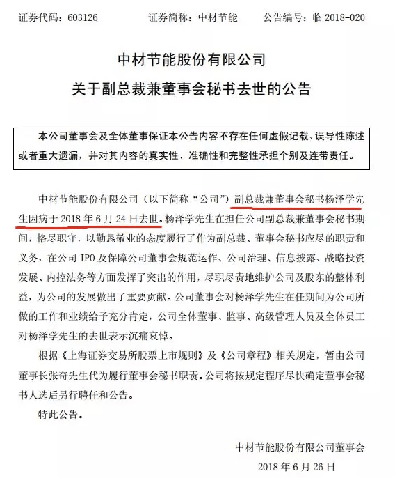 中材節能(603126)6月25日晚間公布,公司副總裁兼董秘楊澤學因病于2018年6月24日去世,暫由公司董事長張奇代為履行董秘職責。