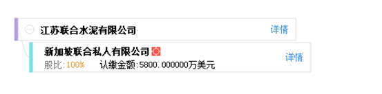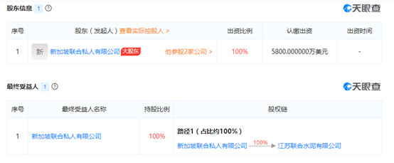 天眼查數據顯示,新加坡聯合私人有限公司為江蘇聯合水泥有限公司最大股東,股比100%,或為直接控股方。
