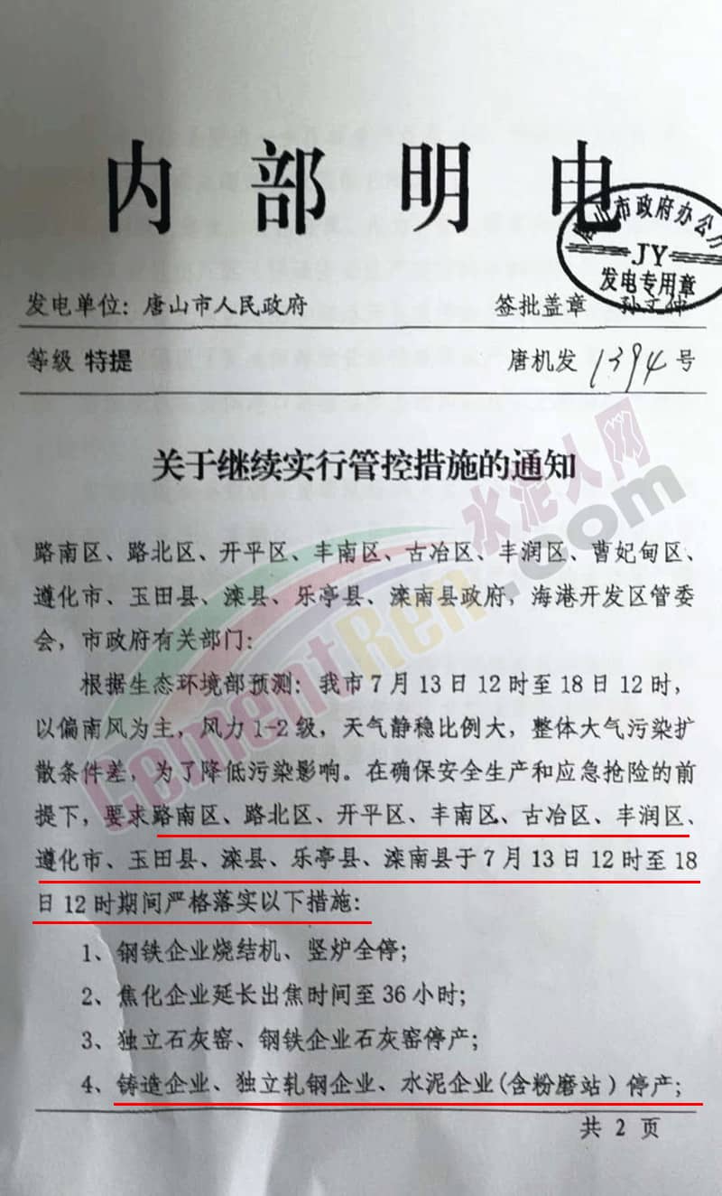 此次唐山市政府為何發出如此嚴厲的文件,不得不從前幾日的停產文件說起,7月6日唐山市豐潤區人民政府發布關于做好近期污染天氣過程應對工作的緊急通知,要求豐潤區所屬水泥企業全部停產(文件如下):