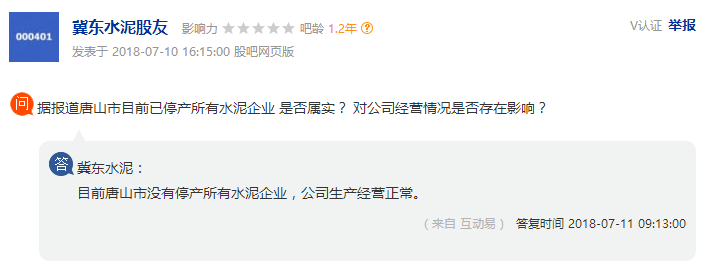 可是在文件發出以后,豐潤區的水泥龍頭企業冀東竟然在投資者平臺上回應:唐山市沒有停產所有水泥企業,公司生產經營一切正常。