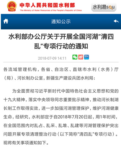 7月9日水利部辦公廳發(fā)布《關(guān)于開展全國河湖“清四亂”專項(xiàng)行動(dòng)的通知》。通知稱水利部定于自2018年7月20日起,用1年時(shí)間,在全國范圍內(nèi)對亂占、亂采、亂堆、亂建等河湖管理保護(hù)突出問題開展 “清四亂”專項(xiàng)行動(dòng)。