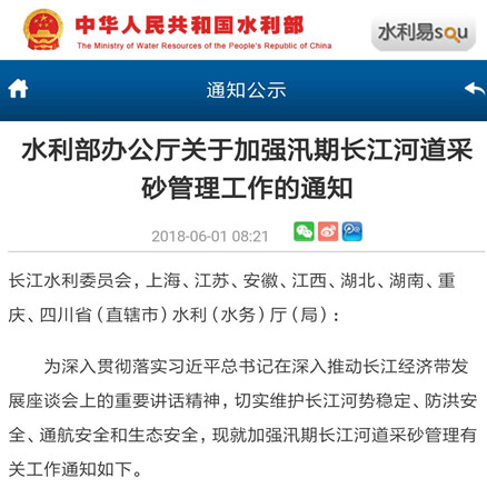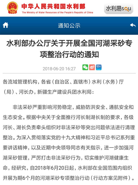 6月20日水利部辦公廳還曾發(fā)布一個(gè)《關(guān)于開展全國河湖采砂專項(xiàng)整治行動(dòng)的通知》通知稱非法采砂嚴(yán)重影響河勢穩(wěn)定,威脅防洪安全、通航安全和生態(tài)安全。根據(jù)中央關(guān)于全面推行河長制湖長制的要求,各級河長、湖長負(fù)責(zé)牽頭組織對非法采砂等突出問題依法進(jìn)行清理整治。