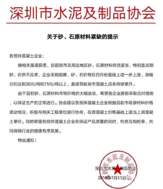 7月11日深圳水泥及制品協(xié)會發(fā)布關(guān)于砂、石原材料緊缺的提示,提示稱據(jù)相關(guān)渠道獲悉,深圳及周邊地區(qū)砂、石原材料供貨緊張,特別是近期砂、石供不應(yīng)求,企業(yè)采購困難,砂、石價(jià)格在四月份基礎(chǔ)上進(jìn)一步上漲,漲幅分別達(dá)到20元/噸和15元/噸以上,直接導(dǎo)致深圳市混凝土成本持續(xù)攀升。由于目前砂、石原材料市場價(jià)格的大幅波動(dòng),協(xié)會希望各企業(yè)提前采取對應(yīng)措施,以保證生產(chǎn)的正常進(jìn)行。協(xié)會建議各預(yù)拌混凝土企業(yè)根據(jù)目前市場原材料價(jià)格波動(dòng)情況,積極與相關(guān)工程單位進(jìn)行協(xié)商,在原混凝土價(jià)格基礎(chǔ)上適當(dāng)上調(diào)混凝土單價(jià)。希望各預(yù)拌混凝土企業(yè)在保證產(chǎn)品質(zhì)量的同時(shí),杜絕互相搶單,共同保障行業(yè)的健康有序發(fā)展。