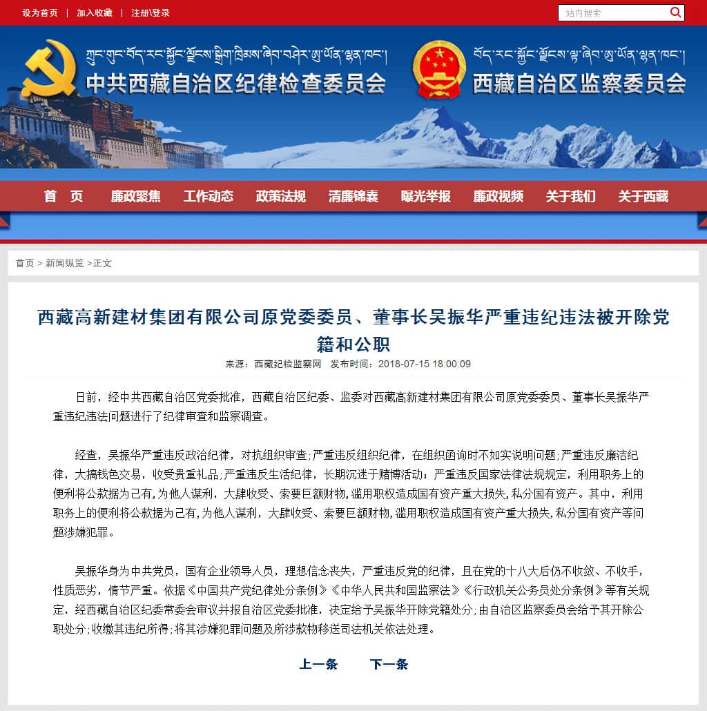 依據《中國共產黨紀律處分條例》《中華人民共和國監察法》《行政機關公務員處分條例》等有關規定,經西藏自治區紀委常委會審議并報自治區黨委批準,決定給予吳振華開除黨籍處分;由自治區監察委員會給予其開除公職處分;收繳其違紀所得;將其涉嫌犯罪問題及所涉款物移送司法機關依法處理。