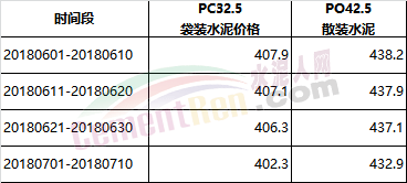 水泥價格方面,流通領域水泥市場價格變動不大,自6月1日至7月10日,水泥價格小幅下調。其中PC32.5袋裝水泥下調1.37%,PO42.5散裝水泥下調1.21%。詳情如下: