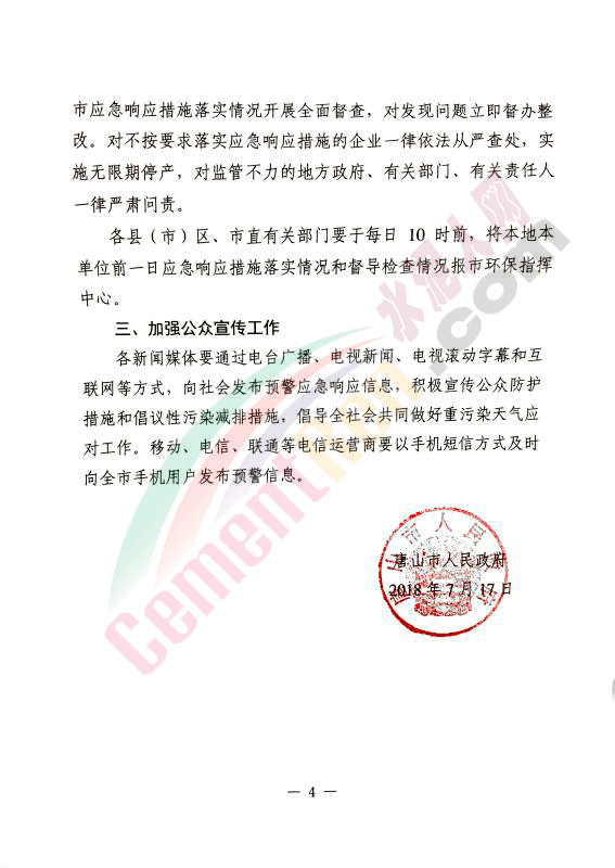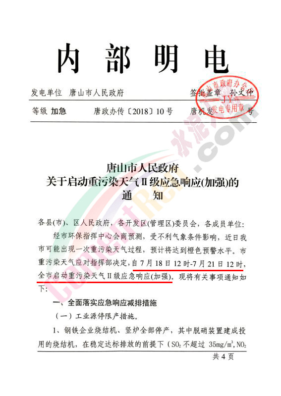 7月11日唐山市生態(tài)環(huán)境保護工作領導小組發(fā)布關于大氣污染物減排攻堅行動的通知。通知稱:為圓滿完成全年空氣質量改善目標任務,按照2018年7月9日全市“十項重點工作”調度會議精神,河北省唐山市決定自7月20日至8月31日在全市開展SO?、NO?、CO污染減排攻堅行動,要求各縣(市)區(qū)政府、開發(fā)區(qū)管委會要抓緊啟動攻堅行動,及時通知鋼鐵、焦化、水泥、玻璃、電力等企業(yè)做好停限產(chǎn)準備,確保7月20日全面實施各項減排措施。(相關鏈接:7月20日起這個地區(qū)水泥企業(yè)或將全面停限產(chǎn)!!)