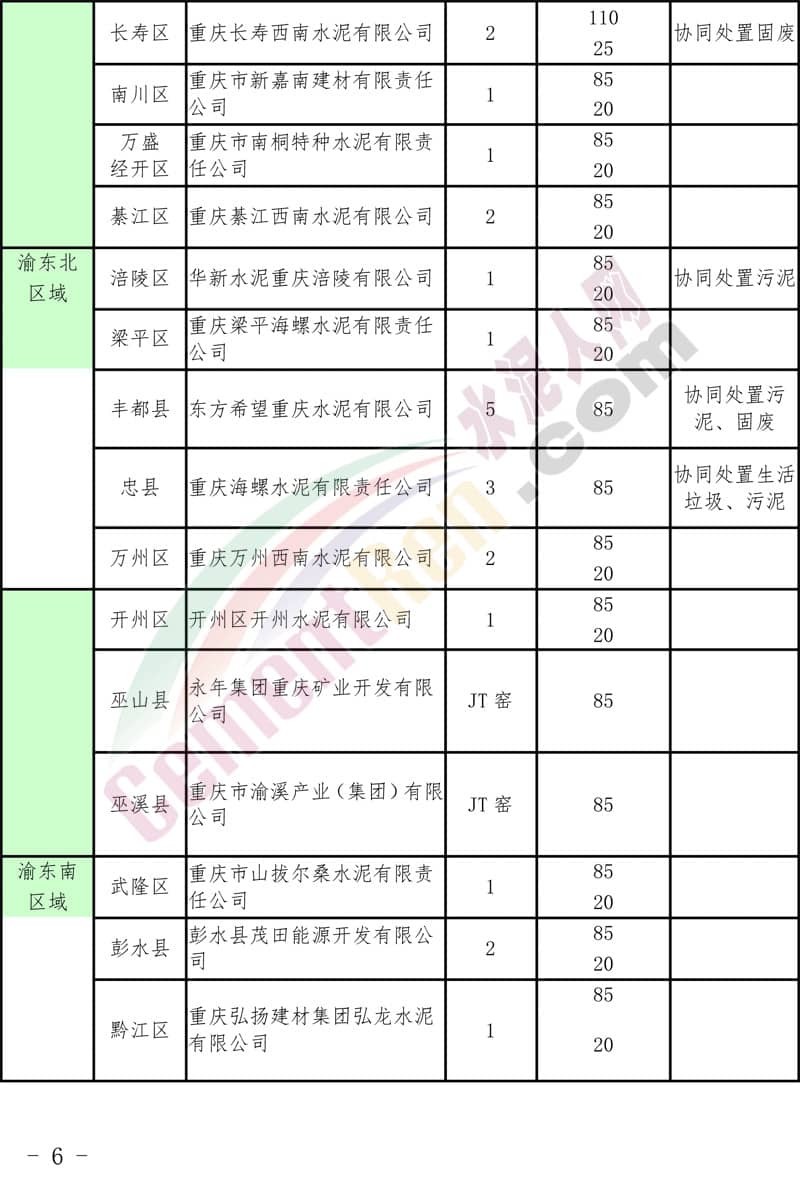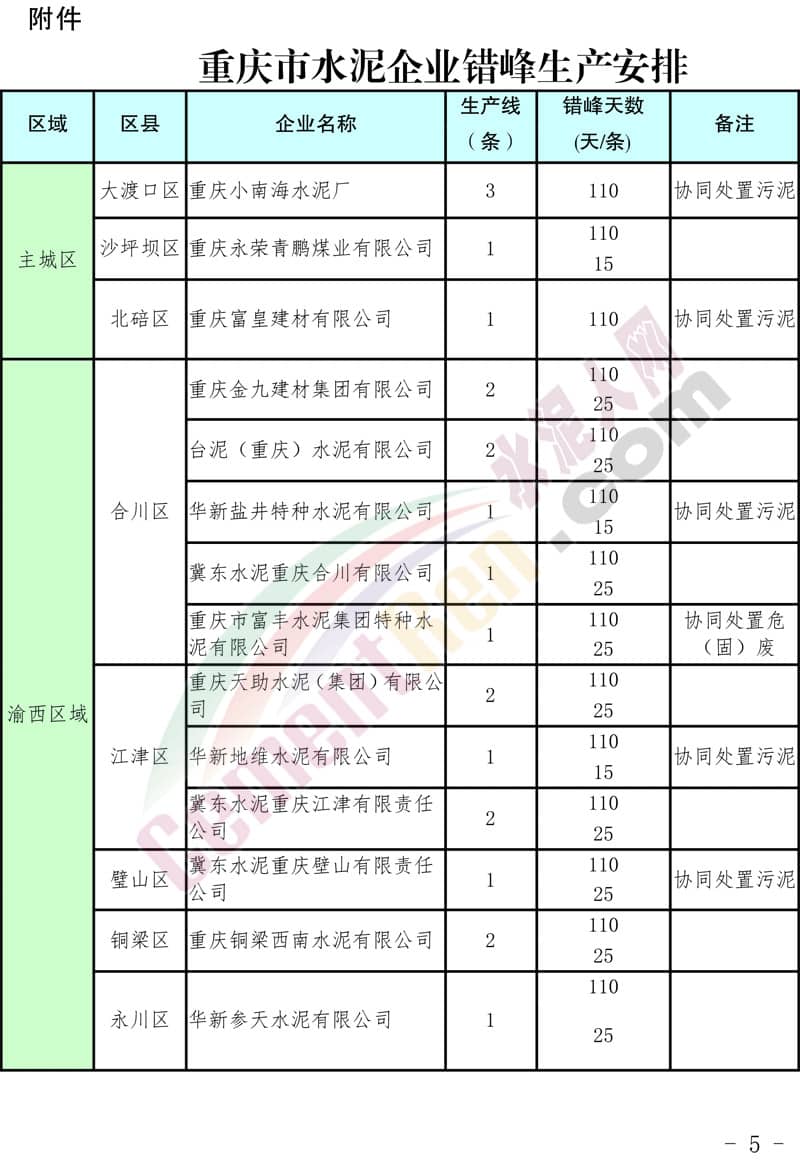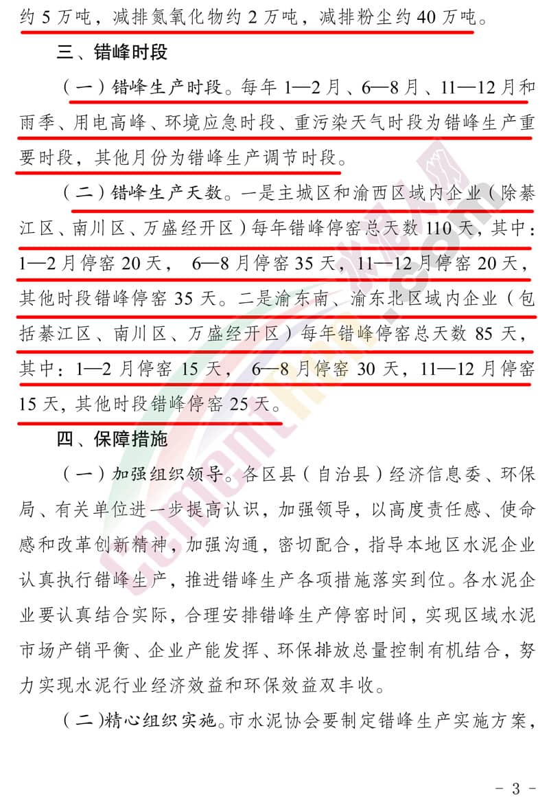 主城區(qū)和渝西區(qū)域內(nèi)企業(yè)(除綦江區(qū)、南川區(qū)、萬盛經(jīng)開區(qū))每年錯(cuò)峰停窯總天數(shù)110天,其中:1-2月停窯20天,6-8月停窯35天,11-12月停窯20天,其他時(shí)段錯(cuò)峰停窯35天;