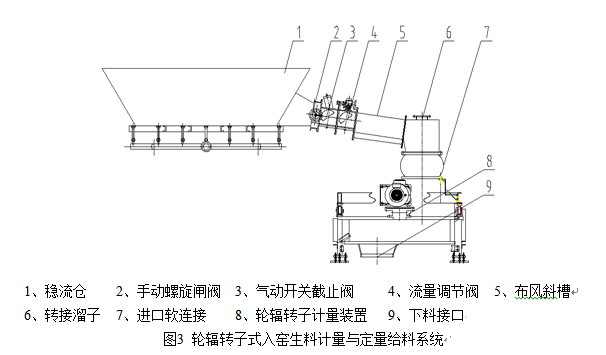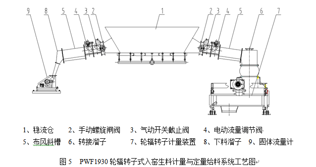 輪輻轉子式入窯生料計量與定量給料系統主要由穩流倉1、手動螺旋閘閥2、氣動開關截止閥3、流量調節閥4、輪輻轉子計量裝置8及電氣控制單元等組成。