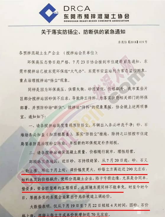同樣是因為環保高壓,供需失衡,砂源緊張,價格飆升,東莞市某些片區部分攪拌站因砂供不應求,導致停工待料,為落實政府相關部門的環保部署,并預防砂場“斷供”,攪拌站“待料”的現象蔓延,協會就上述兩項事宜通知如下: