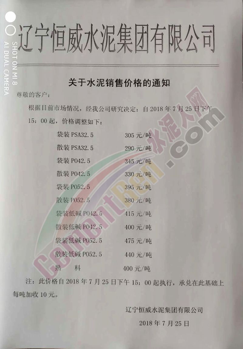 【水泥人網(wǎng)】昨日(25日)遼寧恒威水泥集團(tuán)有限公司發(fā)布關(guān)于水泥銷(xiāo)售價(jià)格的通知,通知稱(chēng),根據(jù)目前市場(chǎng)情況,經(jīng)公司研究決定,自2018年7月25日下午15時(shí)起,調(diào)整各品種水泥產(chǎn)品價(jià)格。詳情如下: