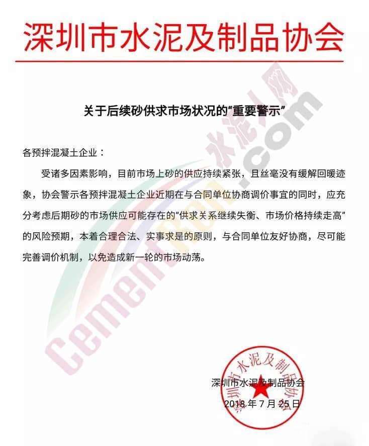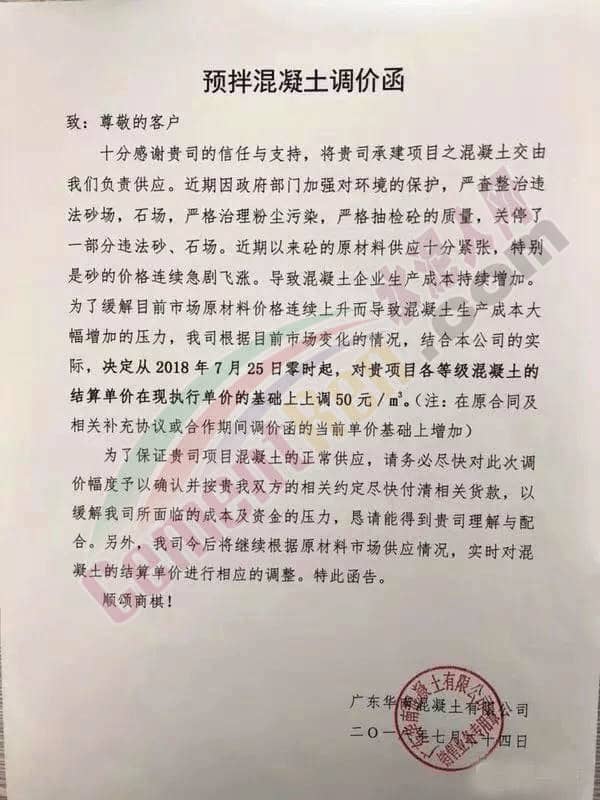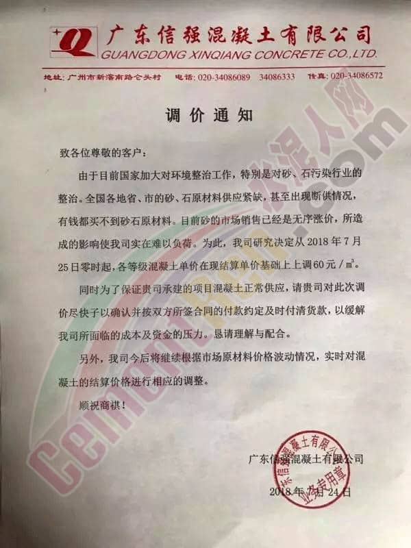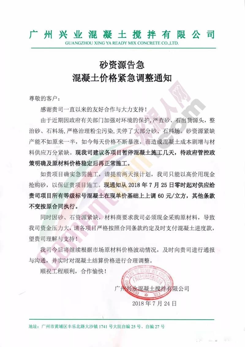 廣東信強混凝土有限公司《調價通知》稱,由于目前國家加大了對環境整治工作,特別是對砂、石污染行業的整治,全國各地省、市的砂、石原材料供應緊缺,甚至出現斷供情況,有錢都買不到砂石原材料。目前砂的市場銷售已經是無序漲價,所造成的影響使公司實難負荷。為此,公司研究決定從2018年7月25日零時起,各級混凝土單價在現結算單價基礎上上調60元/立方。