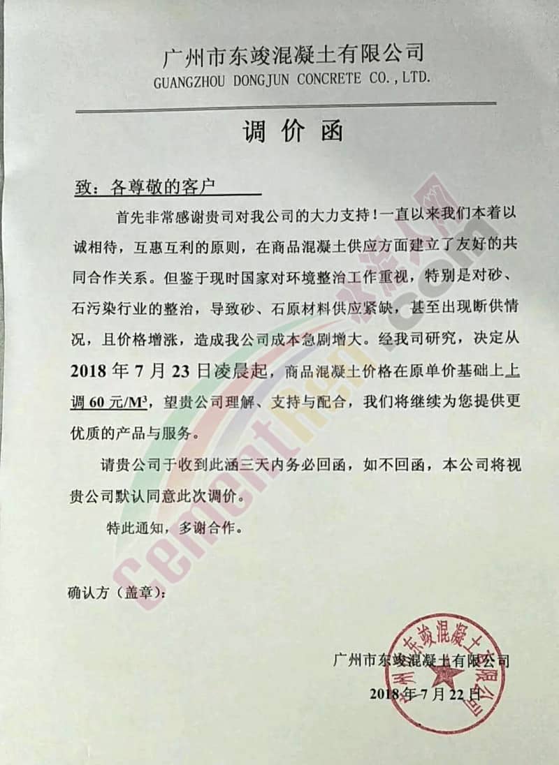 廣州市東竣混凝土有限公司《調價函》稱,鑒于現時國家對環境整治工作的重視,特別是對砂、石污染行業的整治,導致砂、石原材料供應緊缺,甚至出現斷供情況,且價格增漲,造成公司成本急劇增大。經研究決定自7月23日凌晨起,商品混凝土價格在原單價基礎上上調60元/立方。