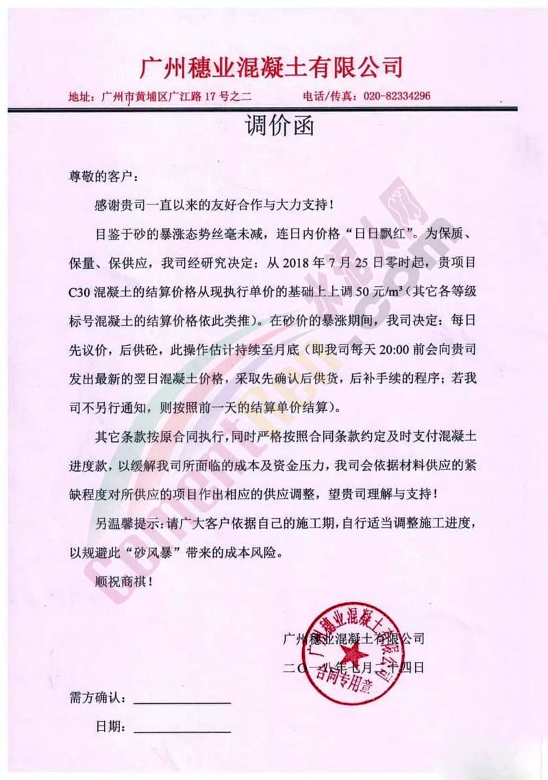 廣州穗業混凝土有限公司《調價函》稱,鑒于砂的暴漲態勢絲毫未減,連日內價格“日日飄紅”。為保質、保量、保供應,公司決定自7月25日零時起,各項目C30混凝土的結算價格從現在執行單價的基礎上上調50元/立方(其它各等級標號混凝土的結算價格依此類推)。
