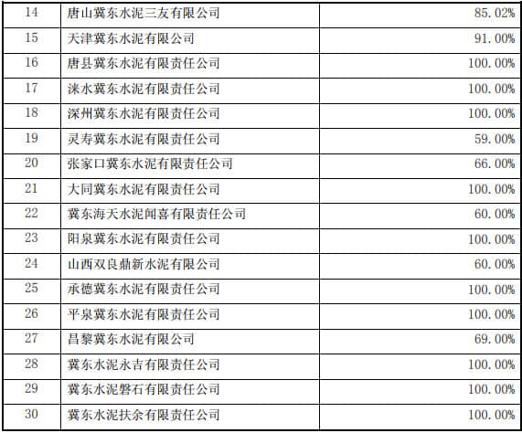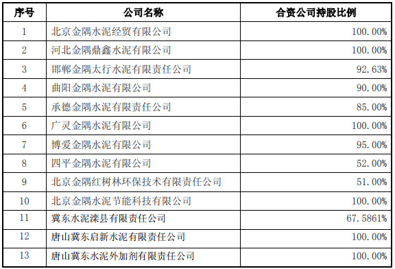 2018年6月21日,唐山冀東水泥股份有限公司唐山分公司及唐山冀東水泥股份有限公司營銷分公司完成工商變更登記手續(xù),冀東水泥完成以分公司資產(chǎn)對合資公司的出資。 2018年7月26日,公司所持有的北京金隅水泥經(jīng)貿有限公司等 10 家公司的股權以及冀東水泥所持有的冀東水泥灤縣有限責任公司等 20 家公司的股權已全部過戶至合資公司,并完成相關工商變更登記手續(xù)。具體情況如下表所示: