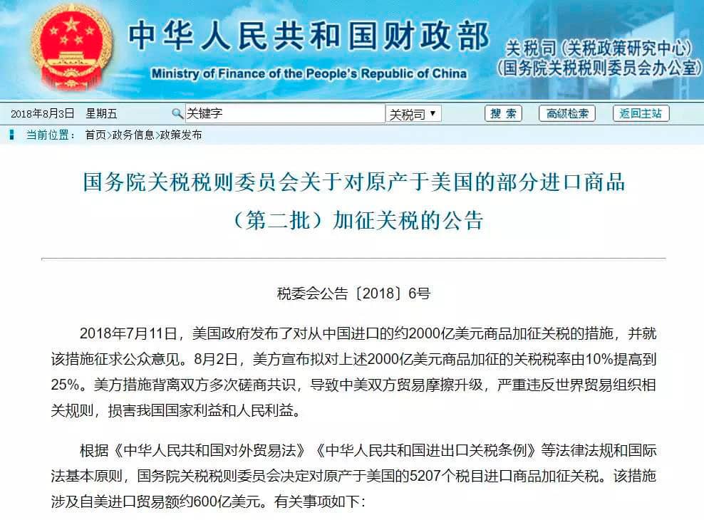 8月3日晚間,財(cái)政部官網(wǎng)發(fā)布了《國(guó)務(wù)院關(guān)稅稅則委員會(huì)關(guān)于對(duì)原產(chǎn)于美國(guó)的部分進(jìn)口商品(第二批)加征關(guān)稅的公告》。