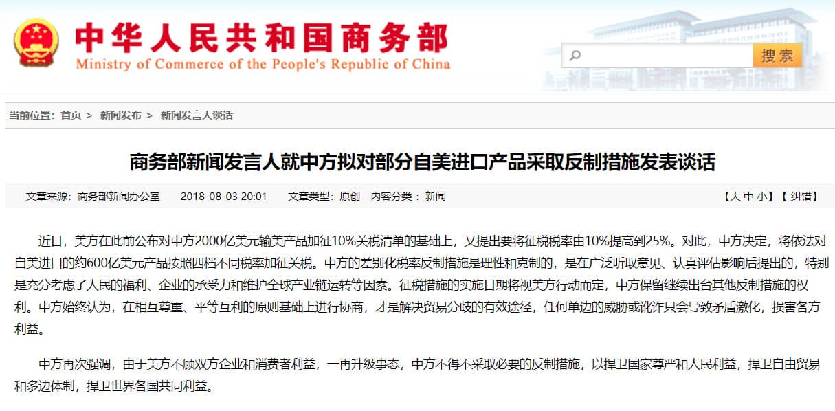 據(jù)央視新聞客戶端消息,2018年7月11日,美國(guó)政府發(fā)布了對(duì)從中國(guó)進(jìn)口的約2000億美元商品加征10%關(guān)稅的措施。8月2日,美國(guó)貿(mào)易代表聲明稱(chēng)擬將加征稅率由10%提高至25%。美方背離了雙方多次磋商共識(shí),單方面再次升級(jí)了貿(mào)易戰(zhàn),嚴(yán)重違反世界貿(mào)易組織規(guī)則,破壞全球產(chǎn)業(yè)鏈和自由貿(mào)易體制,實(shí)質(zhì)性損害了我國(guó)國(guó)家和人民利益,也將對(duì)包括美國(guó)在內(nèi)的世界經(jīng)濟(jì)發(fā)展造成負(fù)面影響。