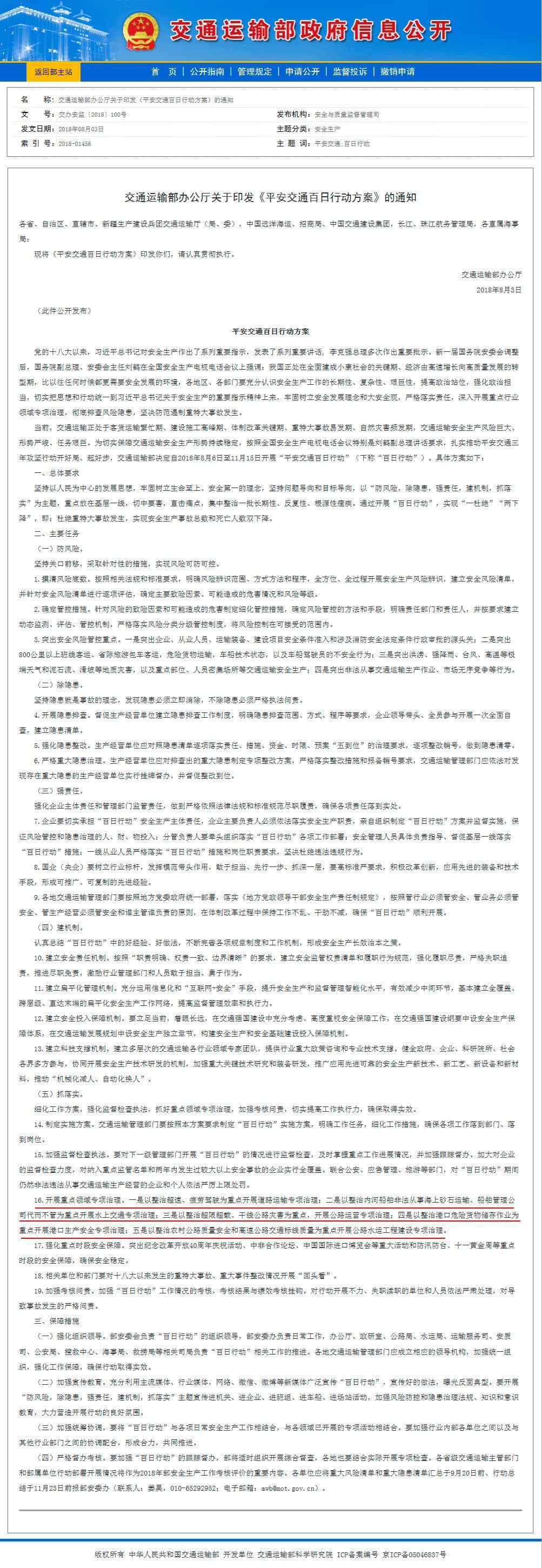 為切實保障交通運輸安全生產形勢持續穩定,交通運輸部辦公廳日前發布了《平安交通百日行動方案》(下稱《方案》),決定自2018年8月6日至11月15日開展“平安交通百日行動”(下稱“百日行動”)。