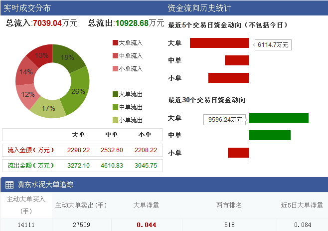冀東水泥(000401)今日大單金額占總成交金額的 4.37%,近5日內資金凈流入709.69萬元,高于行業平均水平-306.69萬元。