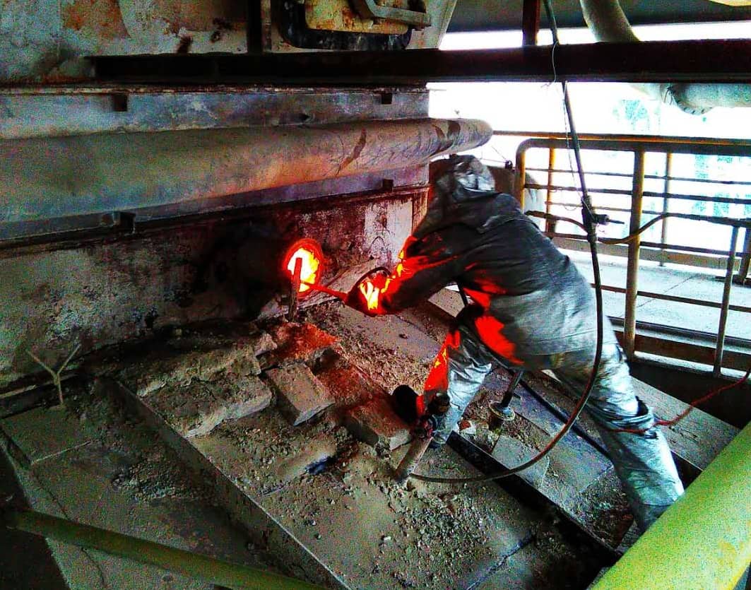 這厚厚的防火服既是他們的“鎧甲”,也是他們炎炎夏日里的“枷鎖”,隨著他們清理預熱器結皮,一下、兩下,汗水已經浸濕了他們的衣衫,火紅的炙烤下,他們仍然忘我的工作著。