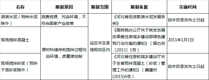 河北省推廣、限制和禁止使用建設工程材料設備產品目錄(2018年版)公示稿所列限制使用的建設工程材料設備中,袋裝水泥(特種水泥除外)因浪費資源、污染環境,不符合國家產業政策,依據《河北省促進散裝水泥發展條例》自目錄發布之日起限制使用。