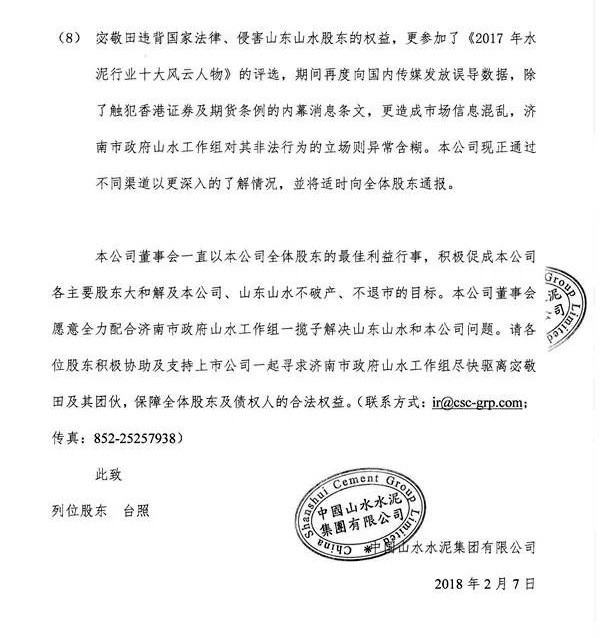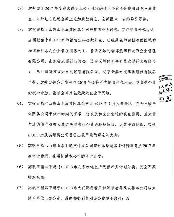 宓敬田指示山東水泥及其附屬公司于2018年1月大量體現(xiàn),完全不顧全體附屬公司于停產(chǎn)時期的正常工作發(fā)放和企業(yè)營運(yùn)的現(xiàn)金需要,等等。