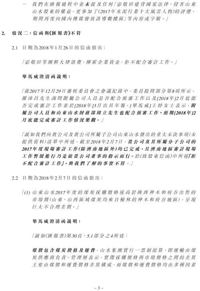 針對“計劃出售生產(chǎn)線”一項,畢馬威表示,“我們在匯報中并未提及任何‘宓敬田指示下屬將山東山水幾條水泥生產(chǎn)線停產(chǎn)并計劃外賣’等內(nèi)容或字眼。”