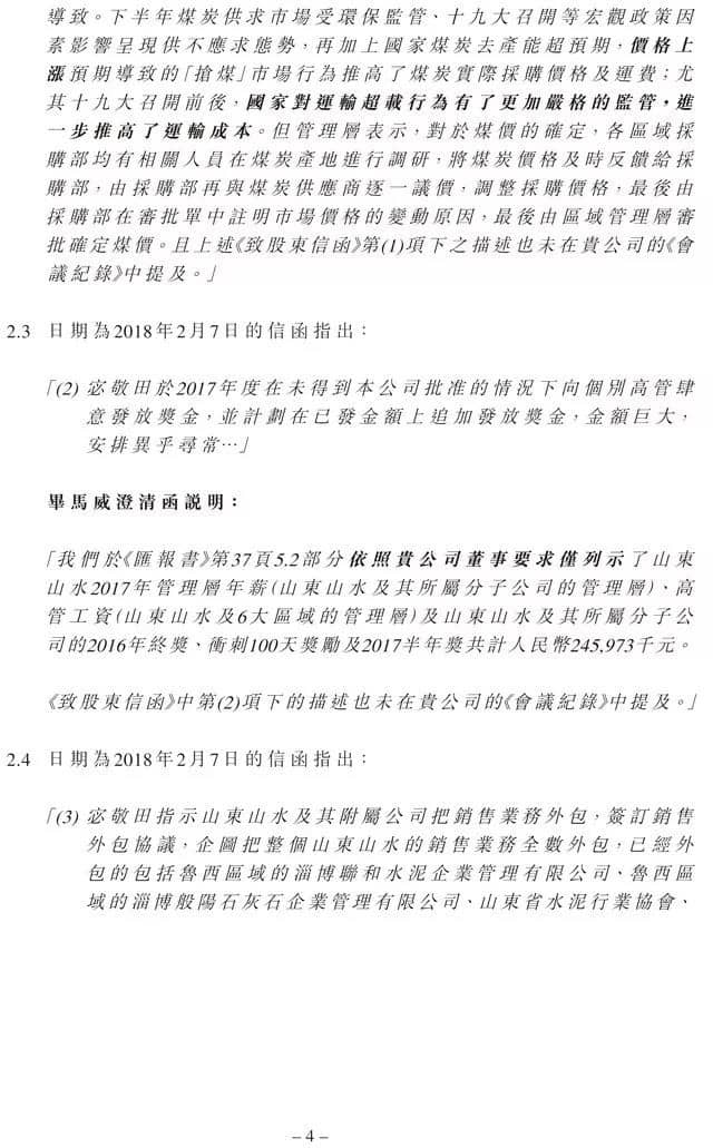 對于“將銷售業(yè)務(wù)外包、致企業(yè)于死地”,畢馬威澄清,該事務(wù)所在匯報中的實際說法是:“銷售平臺是山東山水與附屬公司與行業(yè)內(nèi)聯(lián)合成立的協(xié)同市場價格的平臺組織,各自企業(yè)的銷售業(yè)務(wù)仍由各自企業(yè)銷售人員負(fù)責(zé)。”并不是上述 《致股東函》中所述的“銷售業(yè)務(wù)外包”。