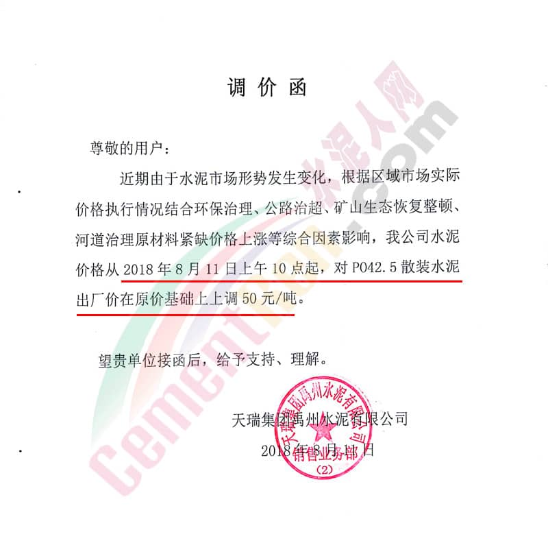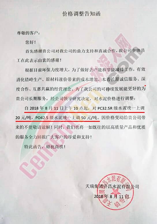 天瑞集團許昌水泥有限公司價格調整告知函稱,根據目前環保力度增大,為了做好去產能和節能減排工作,有效消化錯峰生產、原材料漲價帶來的成本增加,本著長期誠信服務、深度合作、互惠共贏的經營理念,為了公司的可持續發展,自2018年8月11日上午10點起對PC32.5R級水泥統一上調20元/噸,PO42.5級水泥統一上調50元/噸。