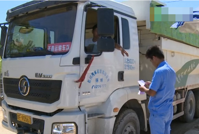 砂場工作人員在查看司機的采運管理單